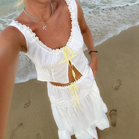 Ilana | Dames Tweedelige set – Aansluitende Top met Kant en Strik & Flared Midi Rok