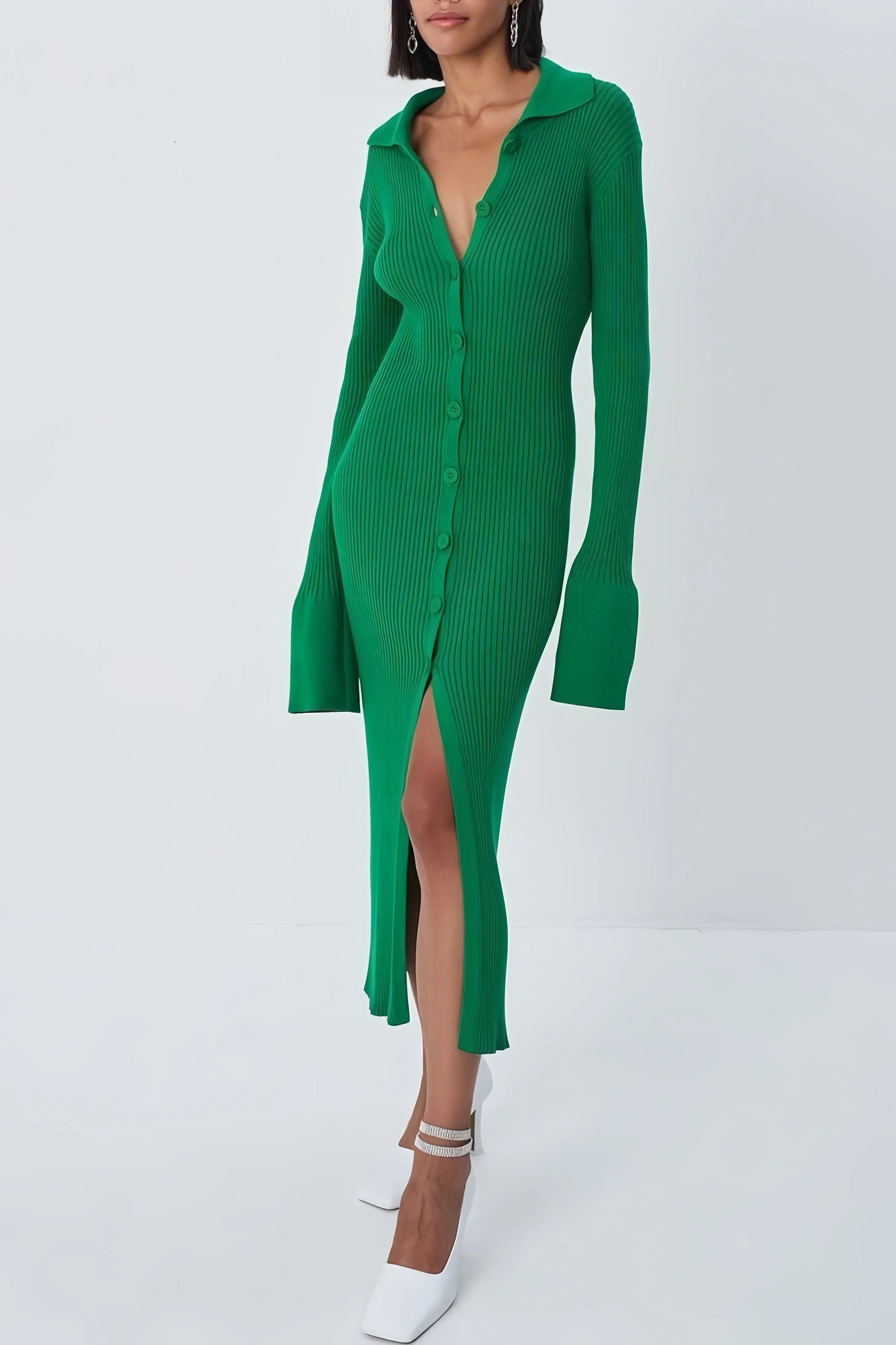 De Ava-jurk is het toonbeeld van tijdloze klasse. De diepe V-hals verlengt visueel het bovenlichaam en geeft een elegante touch, terwijl de midi-lengte zorgt voor een evenwichtige en verfijnde uitstraling. De rechte, licht getailleerde snit volgt subtiel je silhouet zonder strak te zitten. De groene kleur voegt een natuurlijke, frisse sfeer toe die past bij elk seizoen.