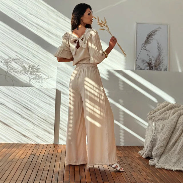 Deze stijlvolle set met strikdetail en wijde broek biedt moeiteloze elegantie en ultiem comfort – perfect voor dagelijks gebruik en onderweg.